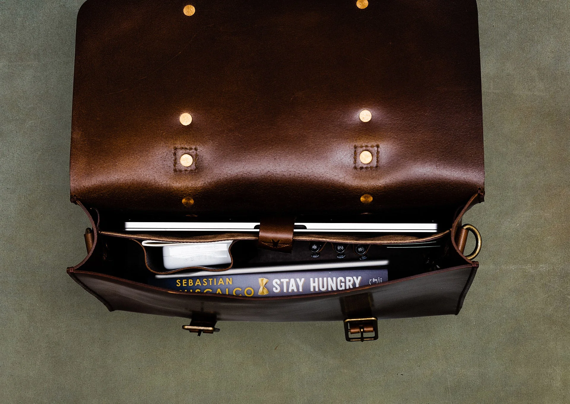 The ultimate durable and functional leather briefcase. You can use it 4 ways: over the shoulder, by the handle, as a backpack, or strapped to your roller-board luggage.